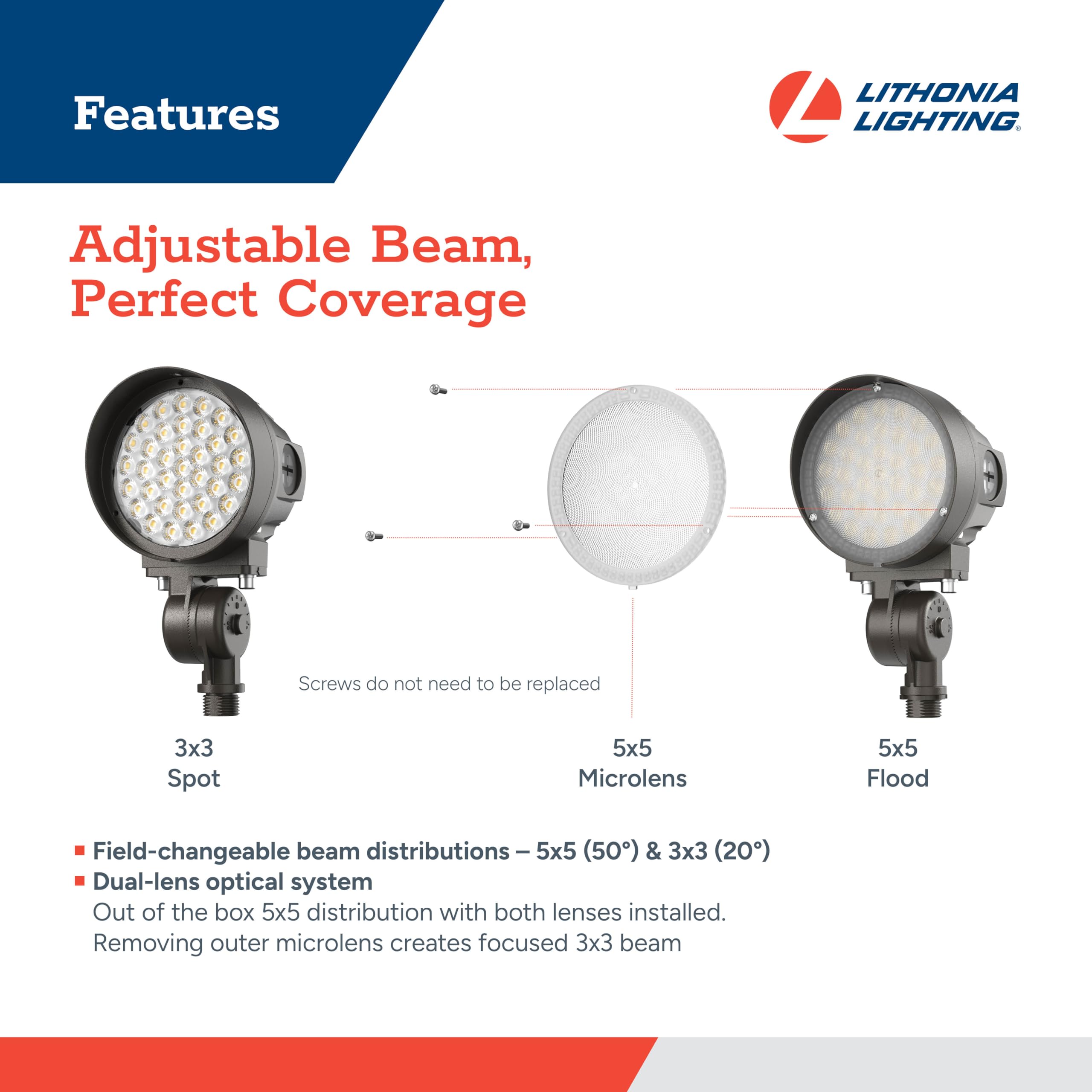 - SWITCHABLE LENS: The flood light ships with the removable 5x5 (50°) lens installed for flood coverage; Remove outer lens to use the 3x3 (20°) spot distribution; Get perfect coverage from an adjustable beam to illuminate signs, facades and landscaping