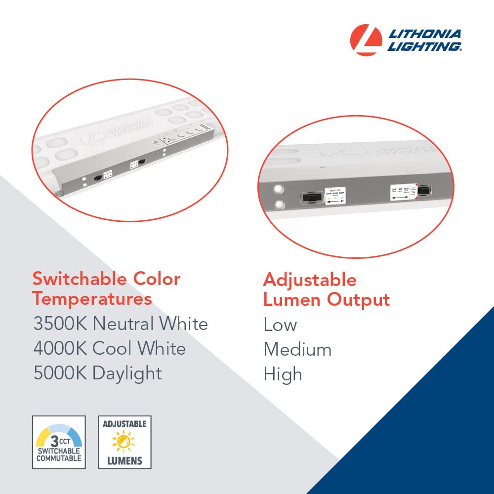 - CONFIGURABLE CEILING LIGHTING: 9 potential configurations in one fixture, using two switches; Adjustable Light Output allows for lumen levels to be adjusted; Switchable color temperature allows flexibility for office lighting, classroom lighting, and more