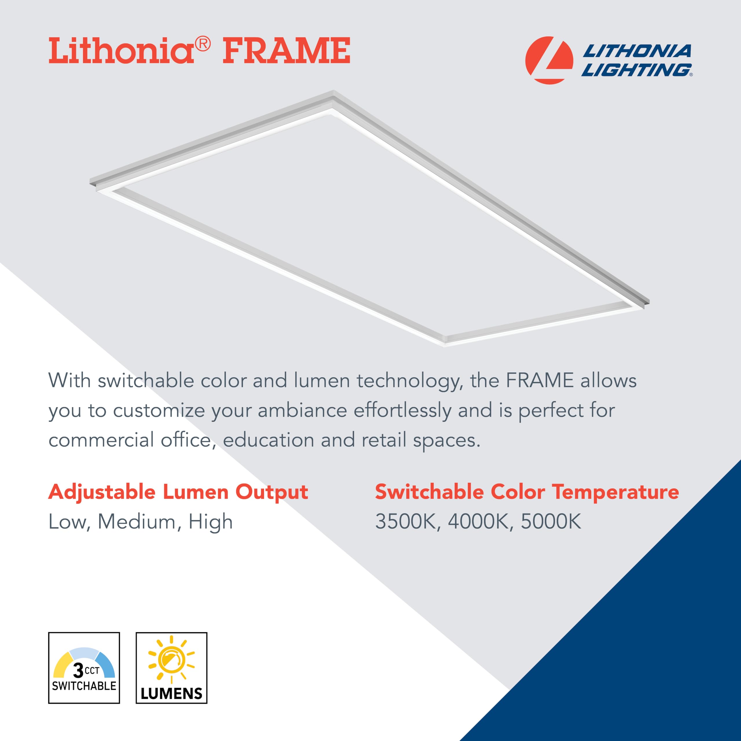 - INNOVATIVE CEILING LIGHTING: The FRAME offers a modern, upscale aesthetic with performance to match; Featuring the latest optical technology, it provides the same efficiency and output as a traditional LED flat panel, for a fraction of the weight and cost