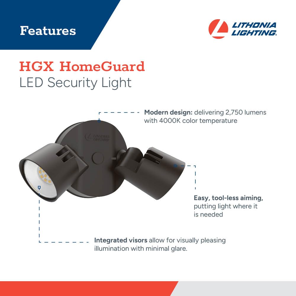 Lithonia Lighting HomeGuard 2-Light LED Outdoor Flood Lights, Wall or Ceiling Mount Outdoor Lights, 4000K Cool White, Round Heads, Dark Bronze, 2-Pack (HGX LED 2RH 40K 120 DDB CP2 M2)