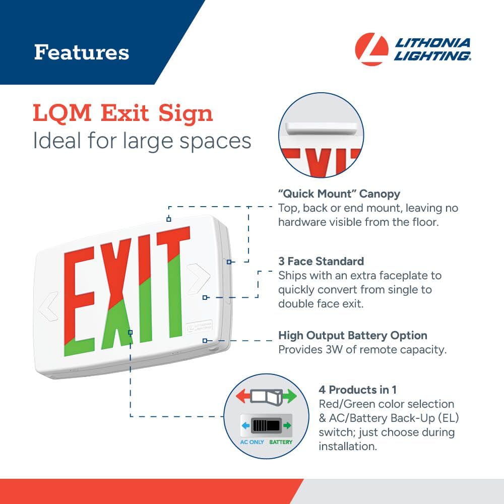 - HEAVY DUTY 4-IN-1 LED EXIT SIGN: The LQM Exit Sign is an attractive, slim exit light that offers red and green letter coloring and a choice between AC or battery back-up; Engineering-grade thermoplastic housing resists impacts, scratches, and corrosion