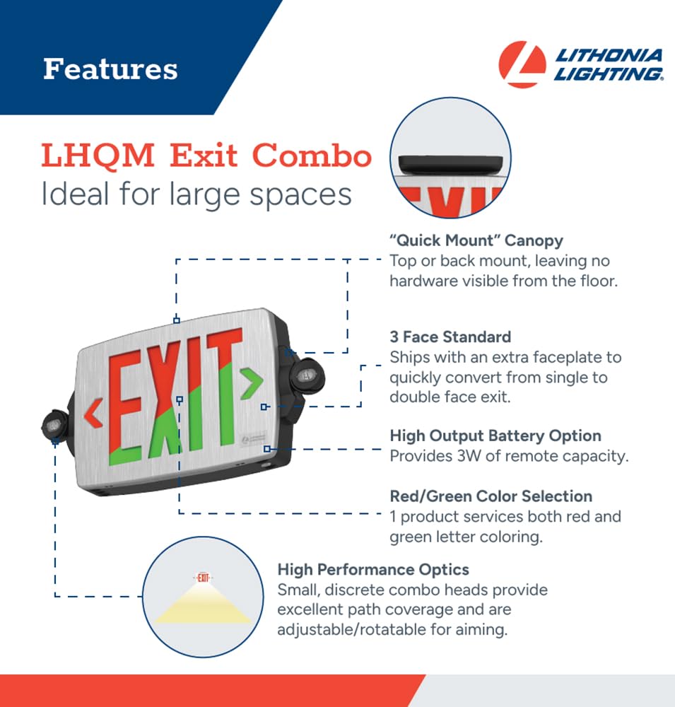 - 2-IN-1 EXIT SIGN & EMERGENCY LIGHT: The LHQM Exit Sign and Emergency Light Combo offers both red and green lettering along with LED light heads for premium egress lighting; Engineering-grade housing has a brushed silver finish for a high-end look